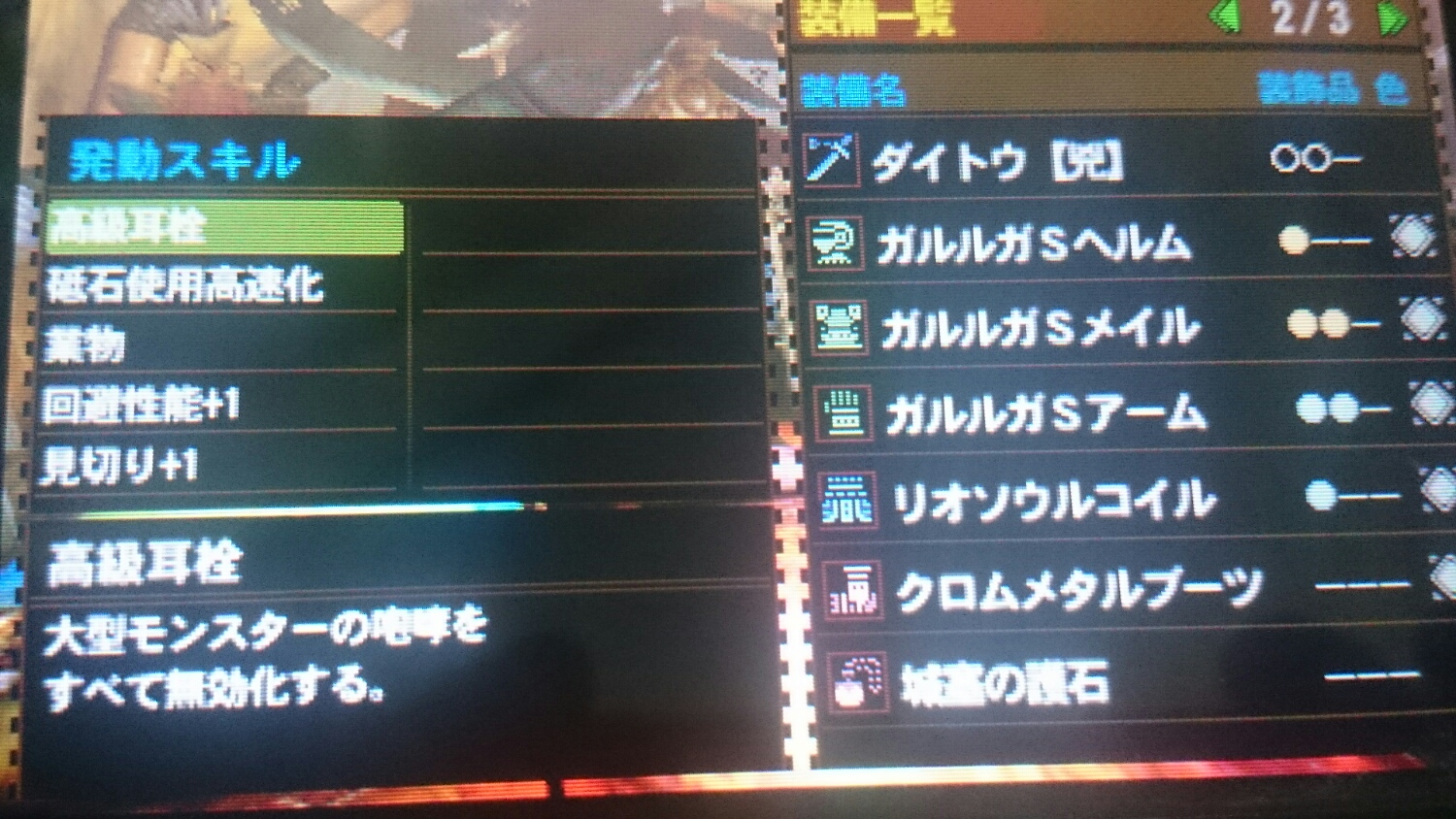 ガルルガとレウス亜種の素材を使った、高級耳栓と剣士汎用スキルが付く装備です。