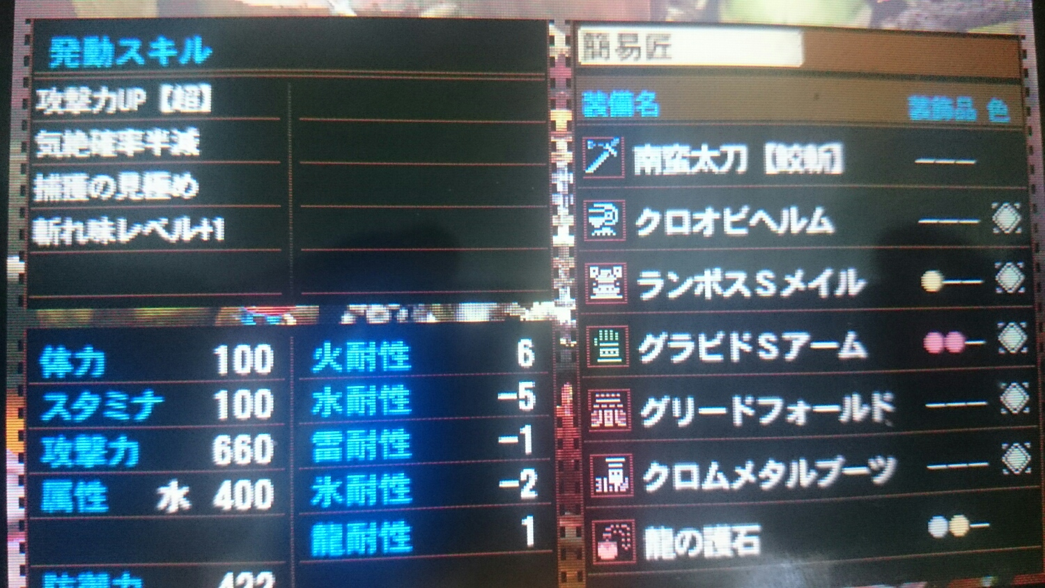 上位ランポス装備の胴と、胴系統倍加を使った、お手軽な斬れ味+1装備です。