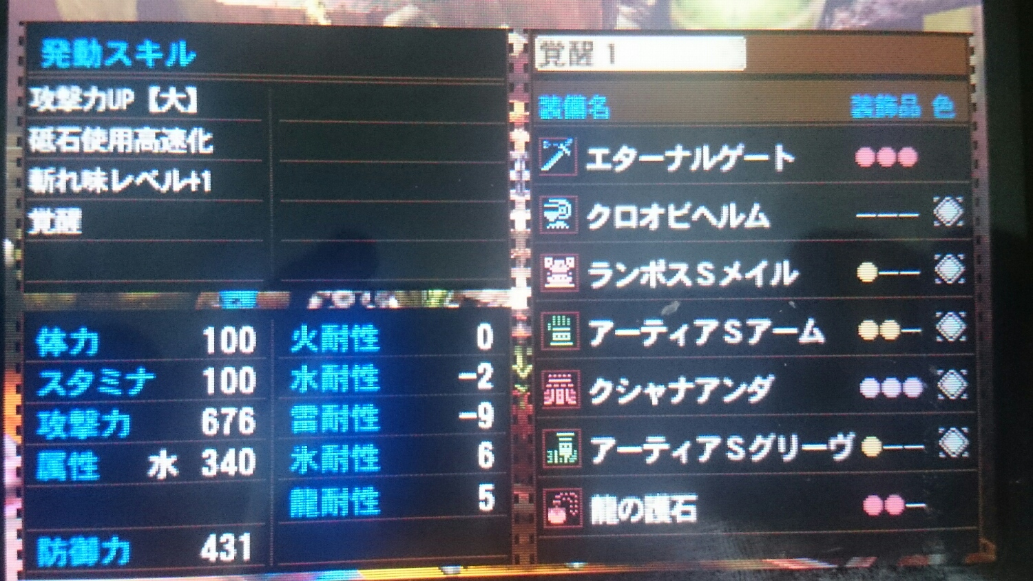 こちらは、アーティアS装備を使った、覚醒と斬れ味+1を両立させた装備です。