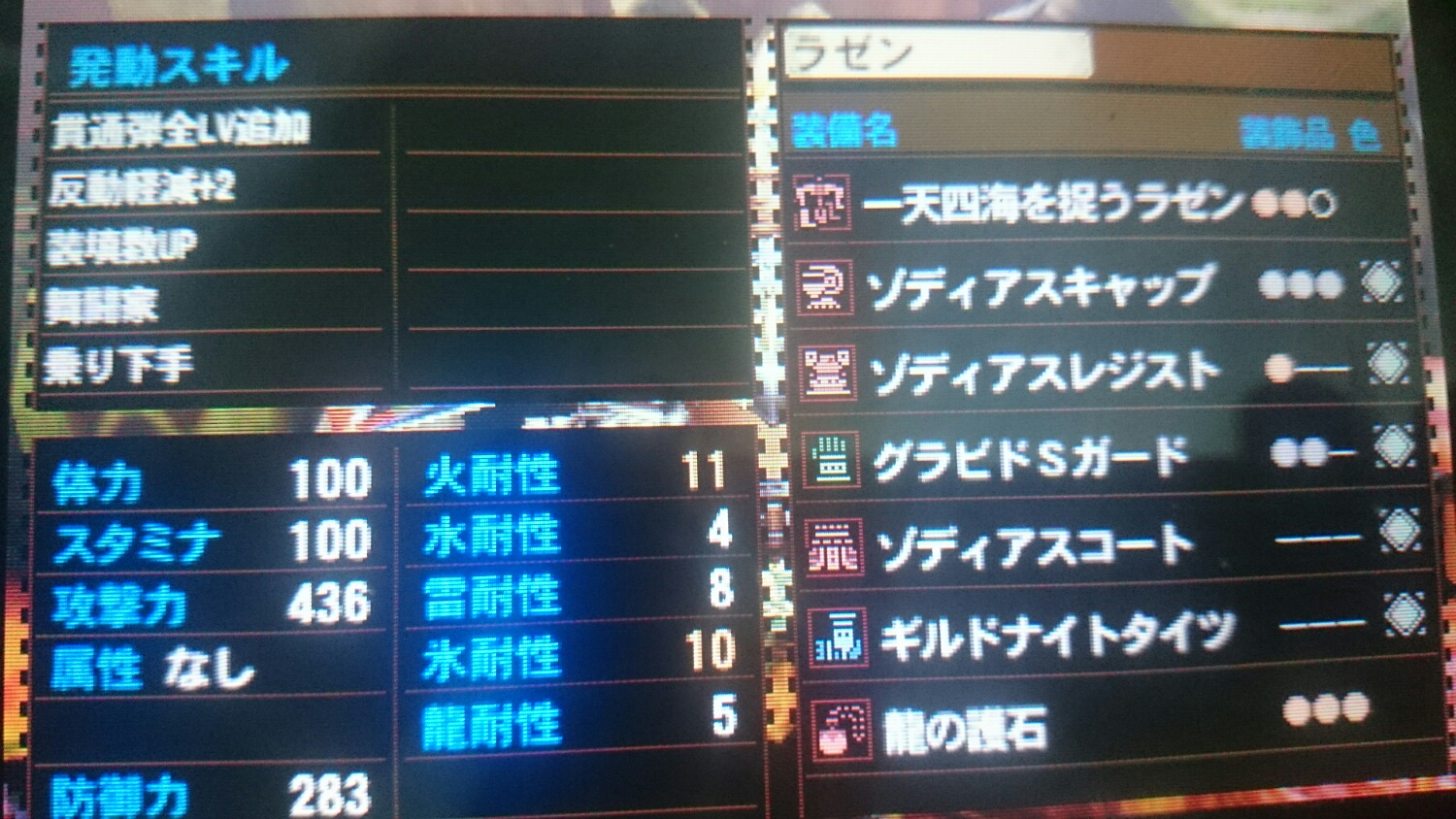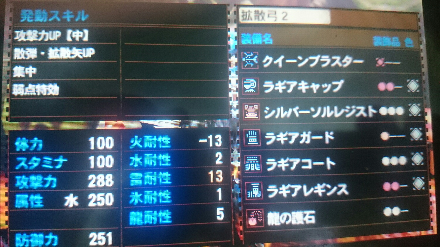 写真では、拡散用スキルになっていますが、装飾品を付け替えれば、貫通用にも連射用にもなりますし、護石も替えれば攻撃力upを回避性能に付け替えることも可能という、汎用性に優れた装備です(*´∇`*)